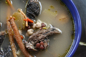 2、锅中放入水煮开,把乌鸡放下,水要没过乌鸡,烧开后撇去浮沫,将葱段、姜片、枸杞子、胡椒粉放下烧开,用小火慢炖,待乌鸡熟后,放少量盐即可。